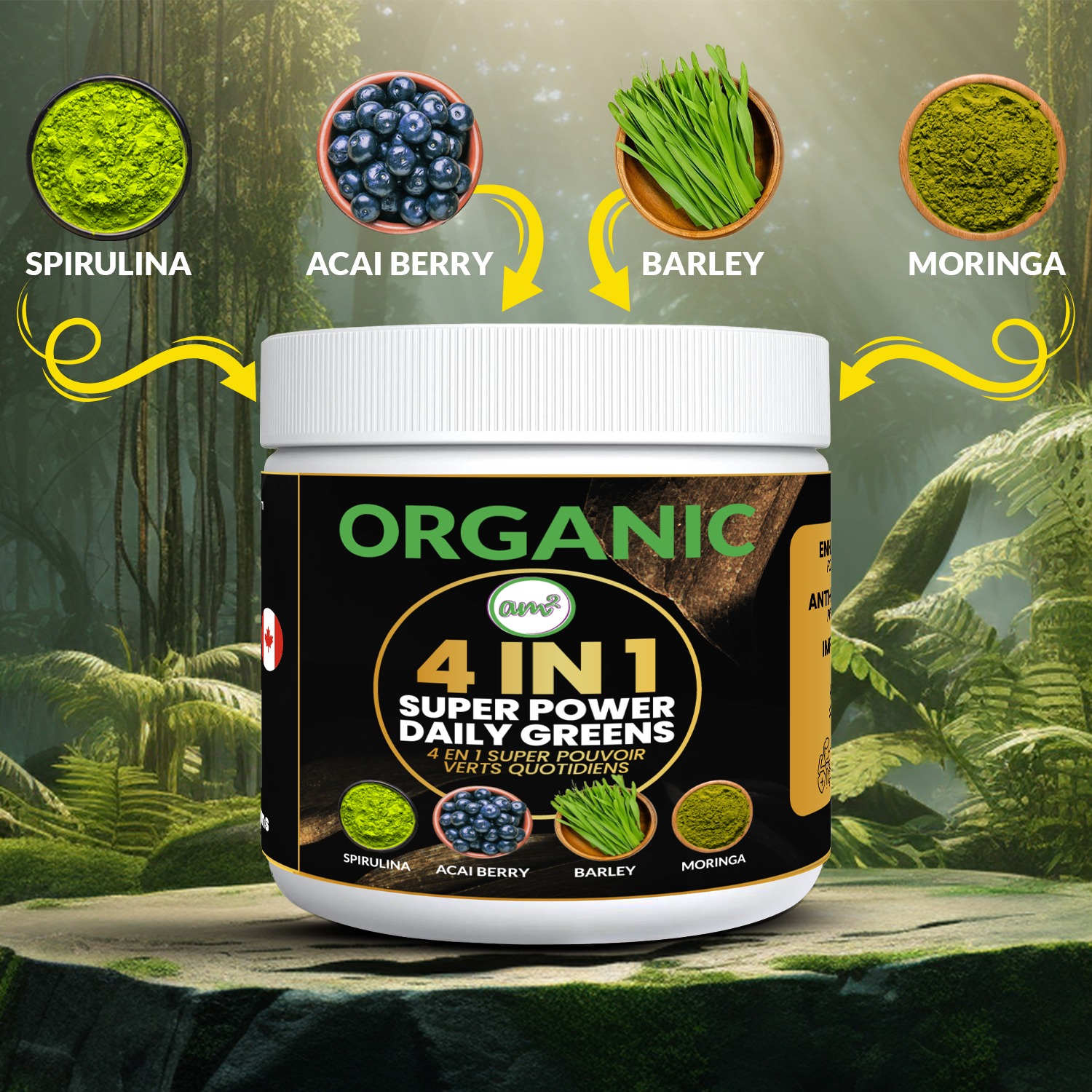 - Ingredients: Organic Barley Grass, Organic Acai Berry, Organic Moringa Leaf, Organic Spirulina
